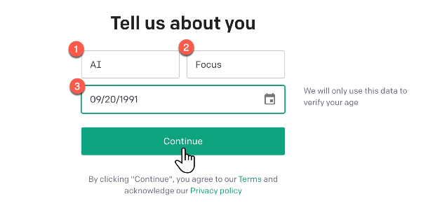아래 그림에서 1에 이름을 2에 성을 각각 입력합니다. 3번에는 생년월일을 월/일/연도 순으로 입력합니다. 생년월일은 나이를 확인하는 용도로만 사용된다고 합니다.
