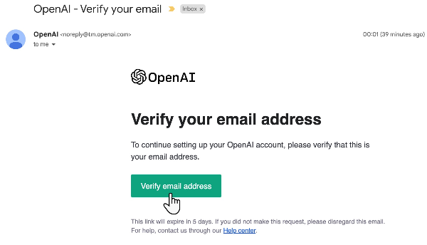 이메일로 이동을 해서 오픈에이아이로부터 온 이메일에 이메일 인증하기 버튼은 Verify email address를 클릭합니다.