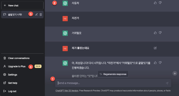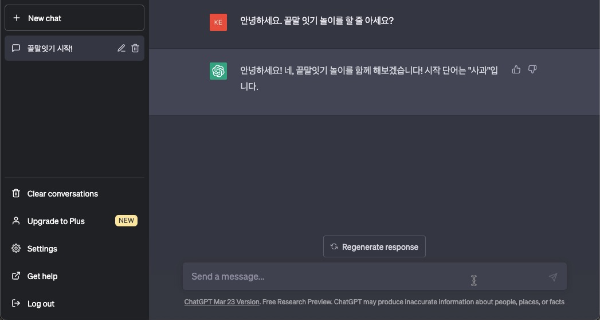챗GPT가 인기를 끈 비결 중의 하나는 사용법이 매우 간단하다는 것입니다. 우리가 친구들과 카톡으로 채팅을 하듯이 하는 게 사용법의 전부이니까요. 그래서 기능도 사실 매우 간단합니다. 제가 끝말잇기 게임을 한 화면으로 간단하게 기능을 설명해 보겠습니다. 그전에 대화한 내용을 좀 보시면 제가 끝말잇기를 틀렸는데도 계속 진행을 하고 있고요. 제가 틀렸다는 것을 먼저 말했는데, 제 말을 잘 이해를 못 하고 미안하다고 오히려 사과를 하네요.