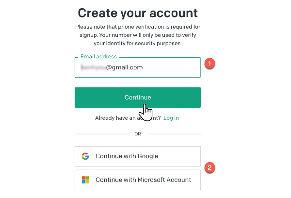 계정 생성은 3가지 방법을 제공합니다. 여기서는 이메일로 가입을 하는 경우를 설명드리겠습니다. 다른 방법으로는 구글 계정으로 가입하기와 마이크로소프트 계정으로 가입하기 방법이 있습니다. 이메일로 가입을 하는 경우는 이메일을 입력하고 Continue 버튼을 클릭합니다.