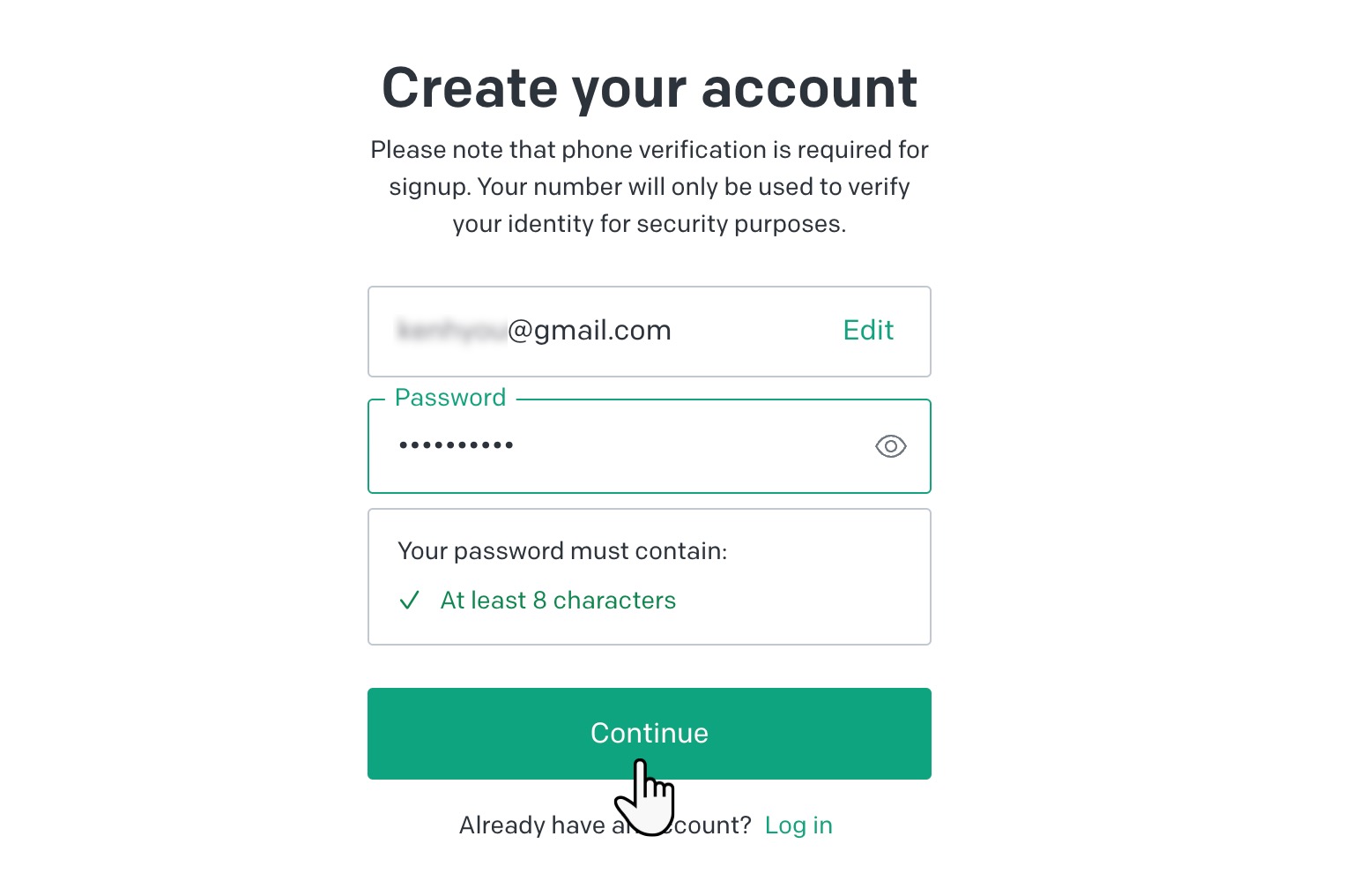 이메일로 가입을 하는 경우 Continue 버튼을 누르면 비밀번호를 등록하는 화면으로 이동합니다. 비밀번호는 대문자, 소문자를 섞어서 최소 8글자를 입력해 주세요. 비밀번호를 입력한 후에는 Continue 버튼을 클릭합니다.