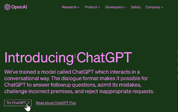 사이트로 이동을 하면 오픈에이아이에서 만든 소개 페이지가 나오는데요. 여기서 Try ChatGPT를 클릭하시면 챗GPT 가입페이지로 이동을 합니다.