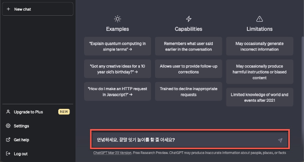 우리가 ChatGPT에게 하고 싶은 말을 하는 곳입니다. 여기에 어떤 내용을 입력하느냐에따라서 우리가 어떤 대답을 받을 수 있는지가 크게 달라집니다. 좋은 질문을 해야 좋은 대답을 얻을 수 있고요. ChatGPT의 고향이 미국인만큼 영어로 질문을 했을 때 좀 더 좋은 결과를 얻을 수 있다고 알려져 있죠.