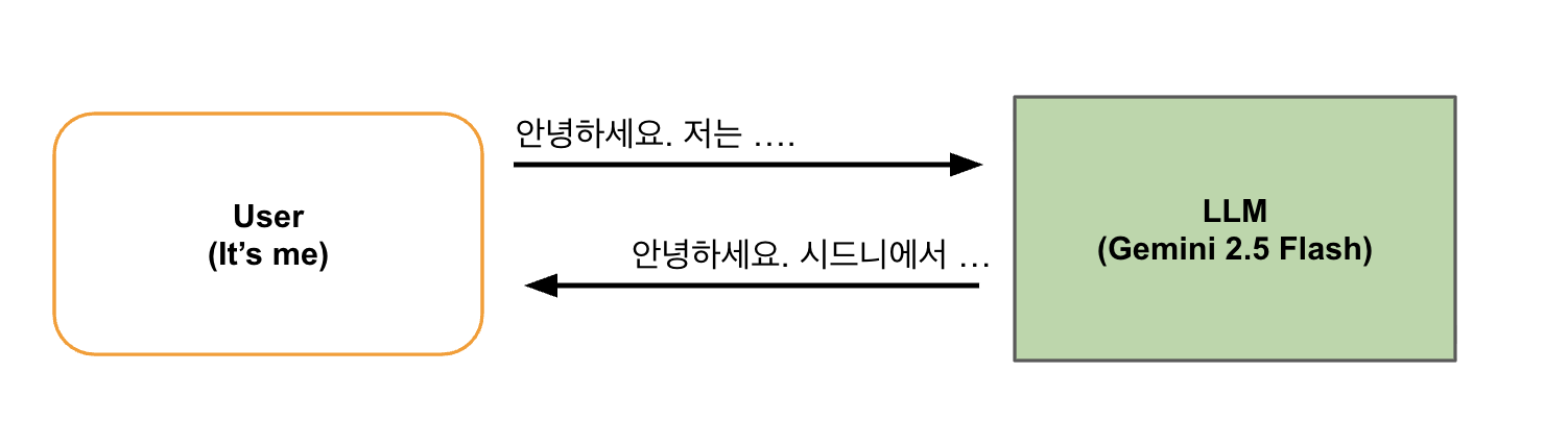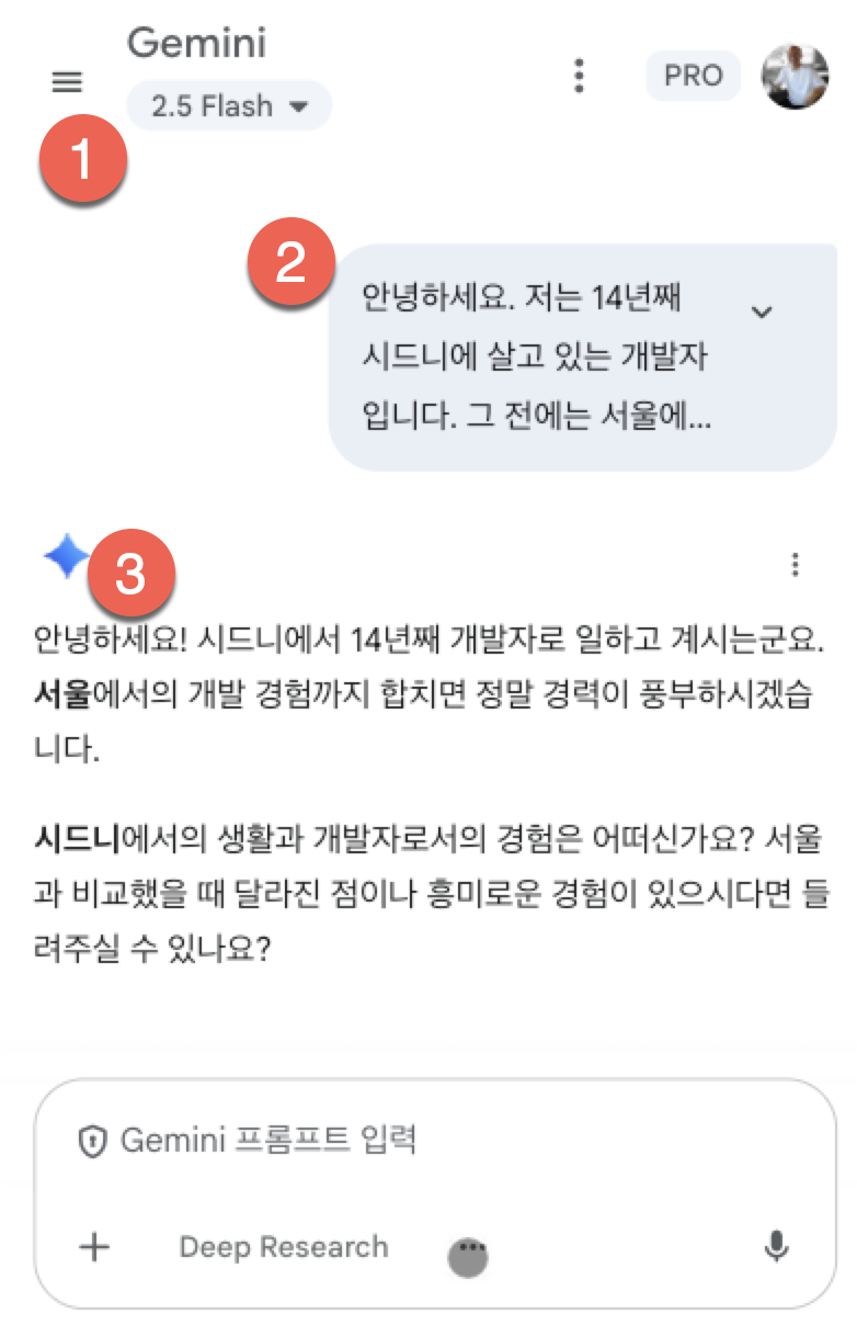 위 그림에서 실제 답변을 해주는 거대 언어 모델은 Gemini-2.5-Flash라는 모델입니다(1번). 아주 단순하게 이야기하면 머리에 순간 떠오르는 단어를 아무 생각없이 내 뱉어내는 아는 게 아주 많은 똑똑한 인공지능 거대 언어 모델(LLM)  중 하나입니다. 사용자가 뜬금없이 자기 소개를 하고 있습니다.(2번) 그러면 제미나이는 확율적으로 가장 많이 나올법한 대답(머리에 순간 떠오르는)을 내놓는 것입니다.(3번)