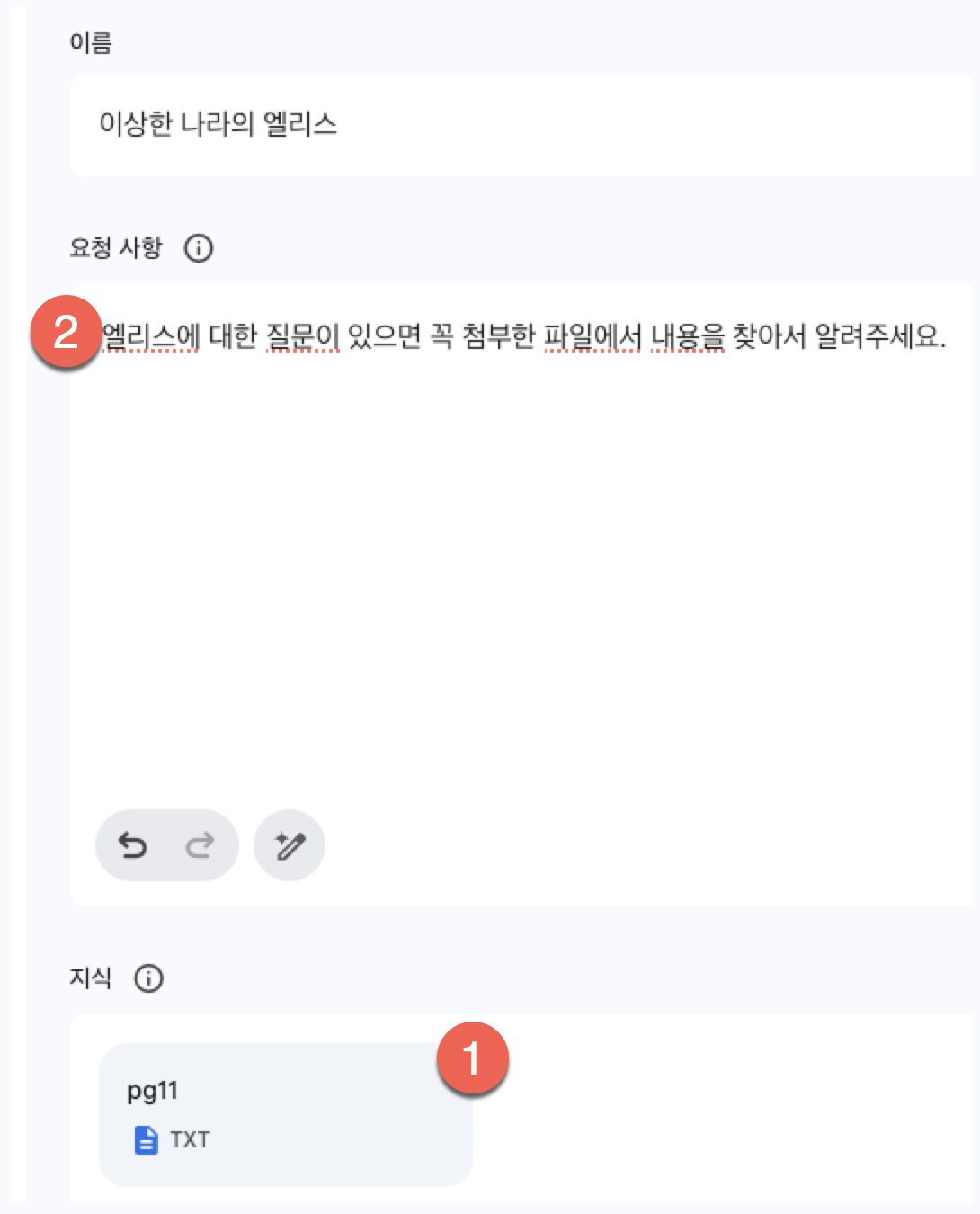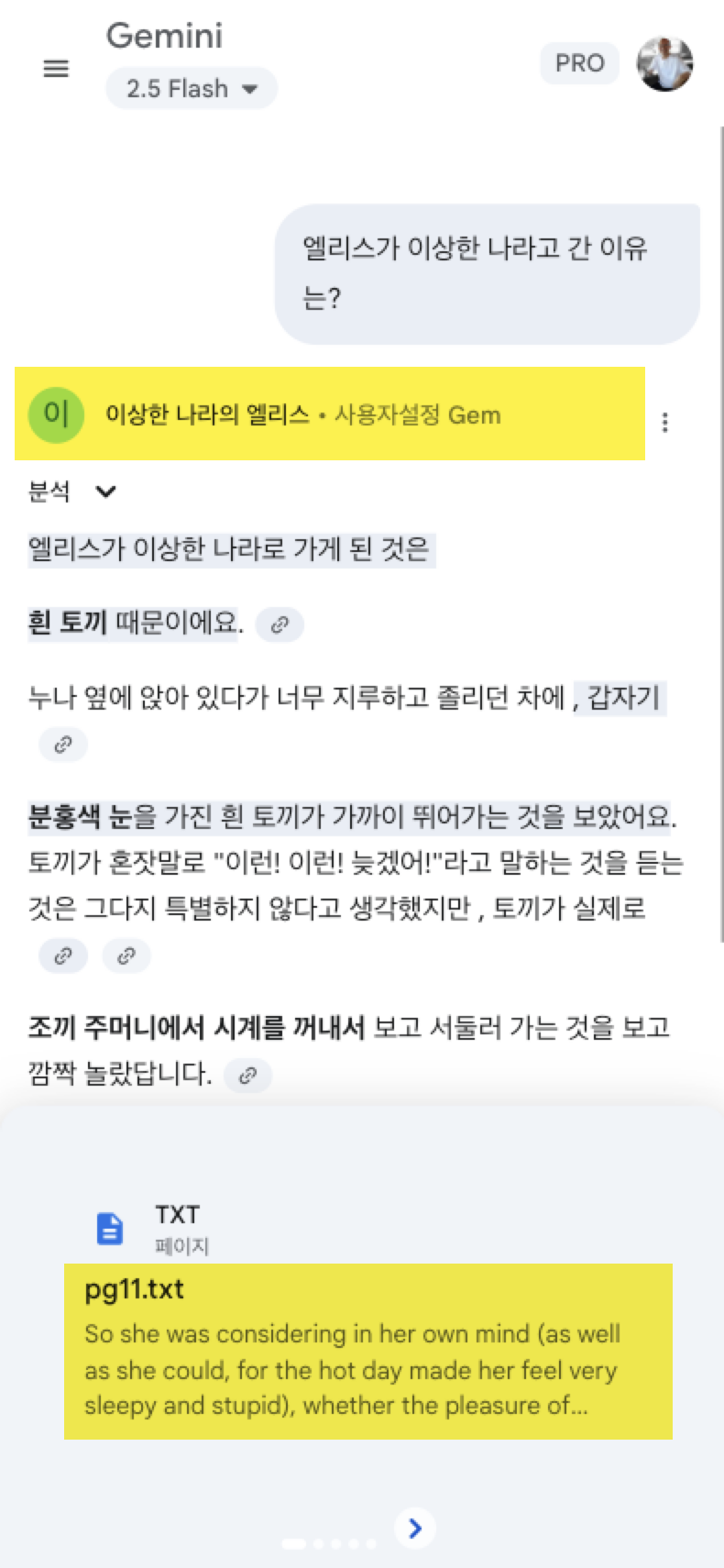 아래는 Gem에 소설 이상한 나라 엘리스를 추가하고(1번) 특별 요청 사항으로 엘리스관련된 질문은 첨부한 소설을 확인해서 답변을 해달라고 요청한 것입니다.(2번)