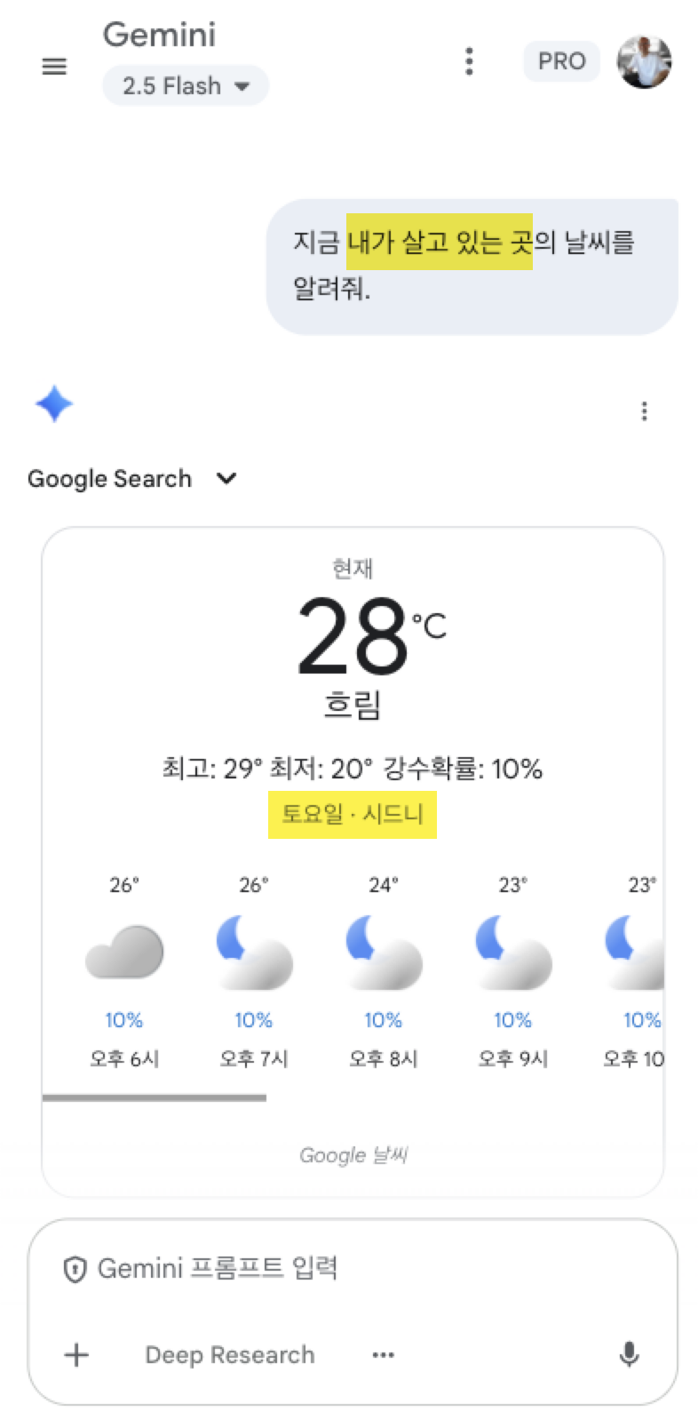 초기에는 챗 어플리케이션에 “오늘의 날씨를 알려줘”라고 하면 아주 친절한 말로 “저는 실시간 데이터는 알지 못 합니다.”라는 답변이 돌와 왔습니다. 하지만 요즘은 “내가 살고 있는 곳의 날씨를 알려줘”라고 해도 답변을 받을 수 있습니다. 저는 이미 앞에서 “나는 시드니에 살고 있다”라고 알려줬다는 것을 제미나이챗에 알려줬습니다. 아래 제가 받은 대답입니다.