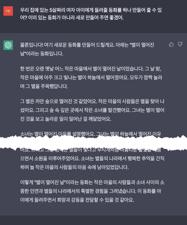 어떤 전문가는 ChatGPT는 거짓말은 진짜처럼 잘한다고 말했습니다. 그렇다면 정말 거짓 이야기를 꾸며내는 것도 잘하겠죠. 그래서 동화를 만들어 내는 것을 시도해 보시는 분들이 많습니다. 왜 소설이 아니고 동화책이냐면요. ChatGPT가 한 번에 다룰 수 있는 데이터 양에 한계가 있거든요. 간단히 아직은 기억력이 소설까지 다루는 데는 한계가 있다는 거죠. 동화를 하나 써 달라고 요청을 해 보죠.