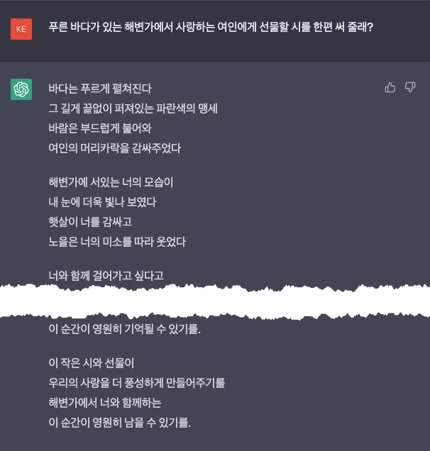 어떠신가요? 내가 소설가라면, 시인이라면 새로운 문장이 써지지 않을 때 챗GPT한테 부탁을 해서 몇 줄만 좀 써 달라고 할 수 있지 않을까요? 꼭 시인이 아니더라도 연인에게 보낼 근사한 시 한 편 적어 달라고 할 수도 있고요.