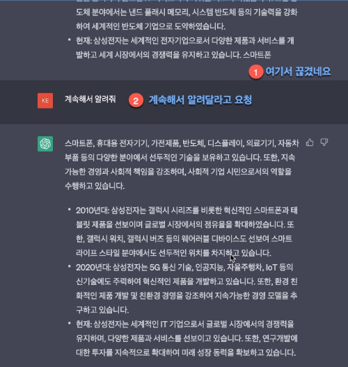 저는 간단히 알려달라고 했는데도 내용을 보여주다가 중간에 멈추었네요. 이것은 현재 ChatGPT가 너무 많은 사람들이 사용하고 있어서 사용에 제한을 좀 두어서 나오는 현상인데요. 그냥 "계속해서 알려줘"라고 채팅창에 치면 끊겼던 부분부터 이어서 답변을 해 줍니다. 아래 그림이 답변이 끊겼다가 다시 연결해서 답변받은 화면입니다.