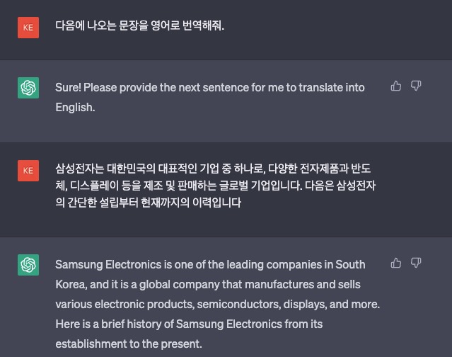 영어를 한글로 번역하는 것도 가능합니다. 두 경우 모두 번역을 요청하기 전에 어떤 상황에서 만들어진 문장인지를 먼저 설명하고 번역을 해 달라고 하면 더 좋은 번역 결과가 나올 것 같네요.