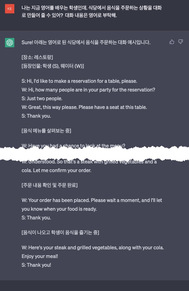 답변을 이렇게 주세요. 참고로, 같은 질문을 해도 ChatGPT는 매번 다른 답변을 주는데요. 이런 면에서 꽤 창의적이라고 볼 수 있고요. 이점이 우리가 ChatGPT를 여러 상황에서 활용할 수 있는 이유 중 하나이기도 하죠. 여행, 호텔, 물건을 살 때 등 상황에 맞는 대화 내용을 요청하면서 영어 공부를 하면 예문 걱정은 안 해도 될 겁니다.